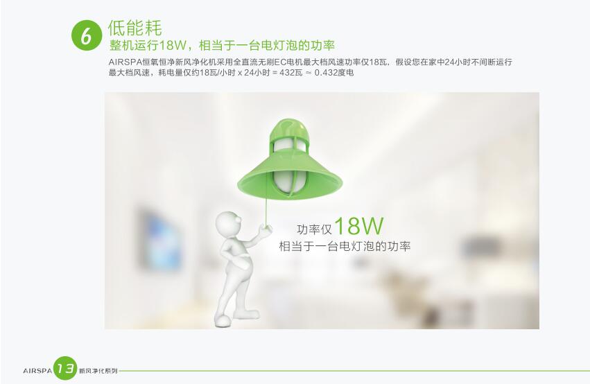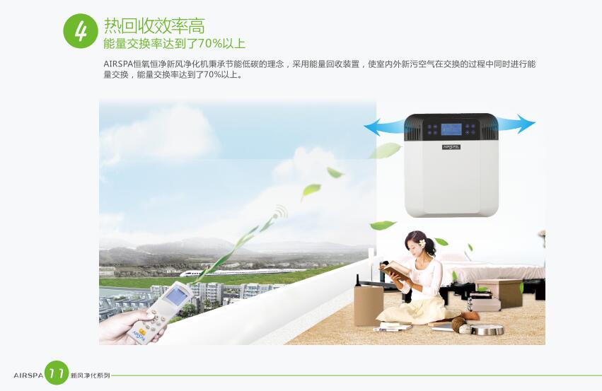 AIRSPA恒氧恒凈新風(fēng)凈化機(jī)秉承節(jié)能低碳的理念,采用能量回收裝置,是室內(nèi)外新污空氣在交換的過(guò)程中同時(shí)進(jìn)行能量交換,能量交換率達(dá)到了70%以上。